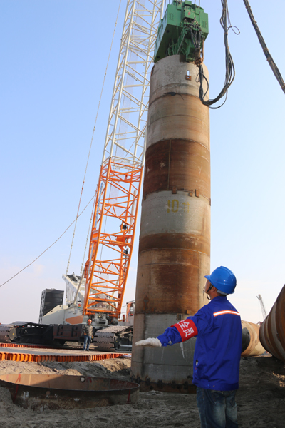 為確保首根樁鋼護(hù)筒順利插打到位,工作人員利用雙利千斤頂及時(shí)解決了施工中遇到的各種難題,確保了鋼護(hù)筒插打順利進(jìn)行,為下一步鉆孔灌注樁施工的全面展開(kāi)創(chuàng)造了有利條件。